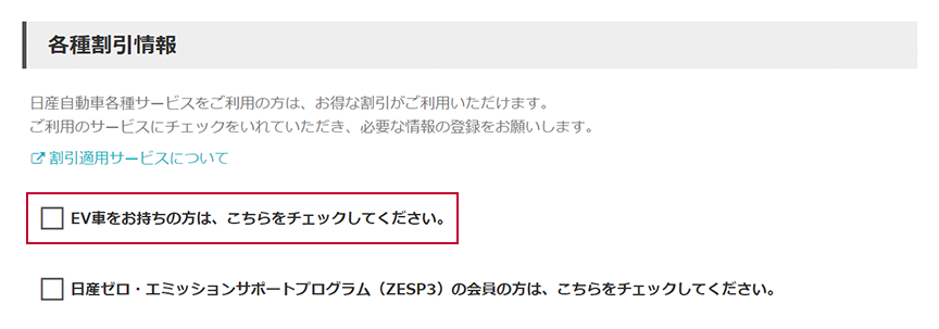①ポータル申込画面の「各種割引情報」にある「EV車をお持ちの方は、こちらをチェックしてください」にチェックを入れます。