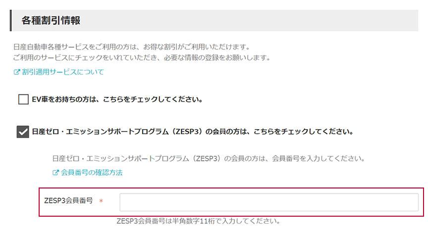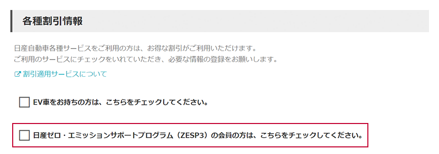 ①ポータル申込画面の「各種割引情報」にある「日産・ゼロエミッションサポートプログラム(ZESP3)の会員の方は、こちらをチェックしてください」にチェックを入れます。