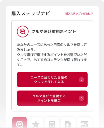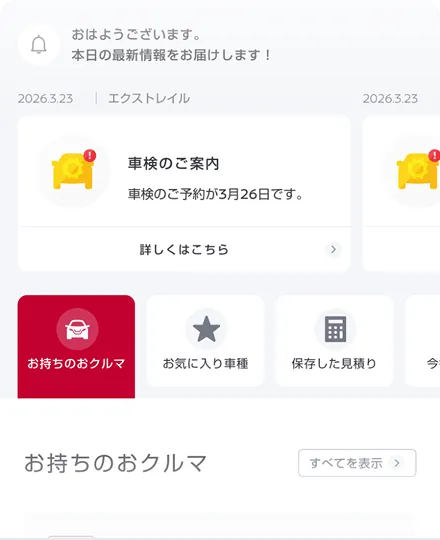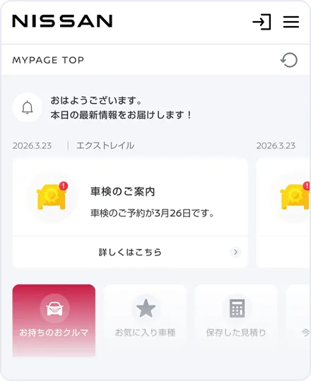 NISSAN IDでご利用いただけるパーソナルサービスです。おクルマのご検討から日々のドライブやメンテナンスまで、一人ひとりの状況に合わせた情報と機能で、快適なカーライフをサポートします。