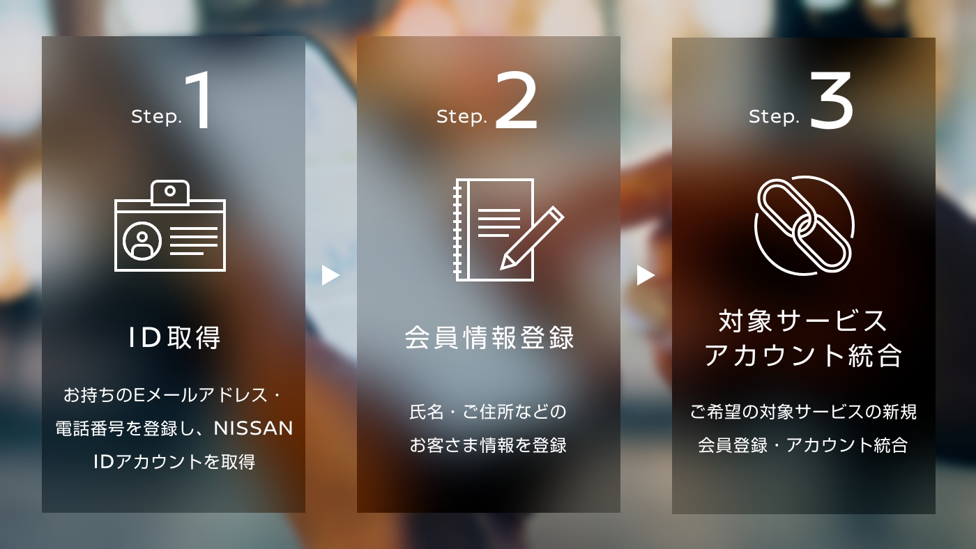 NISSAN IDとは日産グループが提供する会員サービスをご利用いただける共通IDです。オーナーさま向けサービス、EVの充電、レンタカーのご利用、フィナンシャルサービスなど、様々なサービスを快適にご利用いただけます。